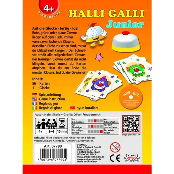 Der Riesenspaß mit der Glocke, jetzt auch für die Allerkleinsten. Wie schon beim furiosen Dauerbestseller Halli Galli geht es auch in der Junior-Ausgabe konzentriert und blitzschnell zur Sache. Sobald zwei gleichfarbige Clowns zu sehen sind, gibt es kein Halten mehr und alle Hände rasen auf die Glocke zu. Aber nicht immer ist es so, wie es scheint. Manchmal sind die Clowns ganz traurig, und dann müssen die Finger still bleiben.Art.-Nr.: 1353243