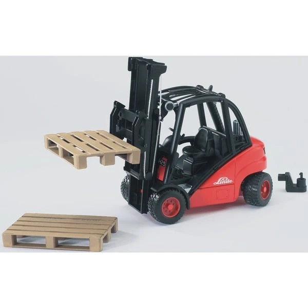 Der Linde Gabelstapler H30D ist ein Industriestapler, der in Natura mit Diesel oder Gas betrieben wird. Das bestechende Porsche-Design des Oginals, stellt eine sehr attraktive Vorlage für das Spielmodell dar. Der Stapler ist mit einem Doppelhubmast ausgestattet, dessen Hub- und Neigefunktion einhändig bedient werden können. Die im Dach angebrachten hydraulischen Neigezylinder dienen zur Einstellung der Hubmastneigung. Das Modell verfügt über eine leicht zu bedienende Lenkung, die es den Kindern ermöglicht eine Ladung wie beim Original auf engstem Raum zu manövrieren. Selbstverständlich sind die Gabelnzinken verstell- und abnehmbar. Im Lieferumfang sind zwei Europaletten enthalten. Profilreifen runden das Bild ab. Art.-Nr.: 1416853
