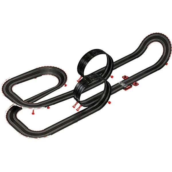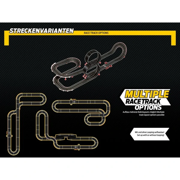 | Inhalt/Ausstattung | 2 Fahrzeuge, GO!!!-Anschlussschiene, Gerade 171 mm, 2 Handregler, Rundenzähler-Schiene, 4 Steilkurven (1/45°), 3 Geraden 100 mm, 3 Geraden 114 mm, 2 Kurven (1/90°), 2 Geraden 342 mm, Looping-Set, GO!!!-Transformator | ||