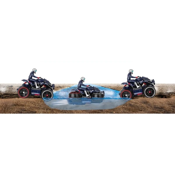 Red Bull steht für jede Menge Action und Speed. Genau das verspricht auch das Carrera RC Red Bull Amphibious Quad Bike. Das rasante Offroad-Gefährt mit den großen Reifen zeigt nicht nur an Land, sondern auch im Wasser, was in ihm steckt. Dabei sorgen Allradantrieb und der umschaltbare Land-Wasser-Modus für ein noch besseres Fahrverhalten im Gelände. Dank Spritzwasserschutz ist das Quad Bike auch für Fahrten auf dem Wasser und auf Schnee bestens gerüstet und begeistert sogar mit coolen Stunts. Die sind natürlich auch auf Land kein Problem: Der 360 Grad-Spin ist ein echter Hingucker und wirbelt ordentlich Staub auf. Das 28 cm lange Modell schafft dabei einen Top-Speed von bis zu 9 km/h und ist somit auch für schnelle Rennen bestens geeignet. Bis zu 20 Minuten dauert die Fahrt, bevor der LiFePO4-Akku für 50 Minuten aufgeladen wird. Egal ob an Land oder im Wasser, hier gibt man Gas!Art.-Nr.: 1729028