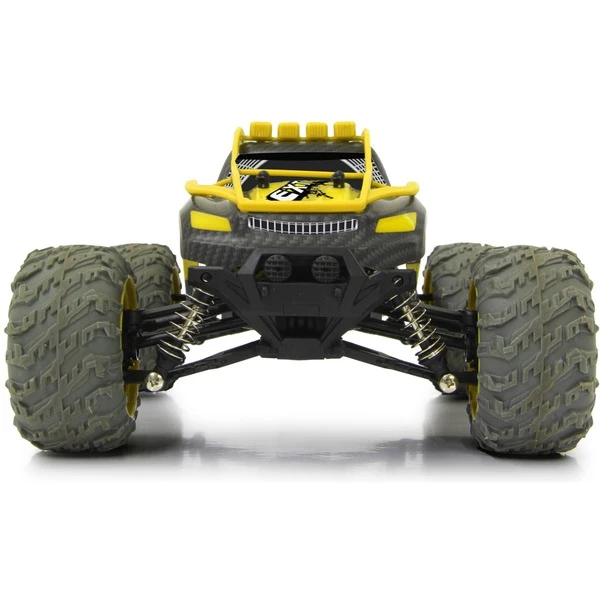 Der Jamara Extron Monstertruck verfügt über einen kräftigen Bürstenmotor und ist spielend leicht zu steuern. Dank Allradantrieb mit kugelgelagerten Antriebswellen vorne und hinten kommt man überall gut voran. Dazu ist das Fahrwerk voll gefedert und die maximale Geschwindigkeit von Anfänger bis Profi am Sender voreinstellbar. Zur weiteren Ausstattung gehören eine Einzelradaufhängung vorne und hinten, weiche Gummireifen mit Stollenprofil, ein Rammschutz vorne und hinten und eine stabile Karosserie mit Überrollkäfig. Art.-Nr.: 1683605