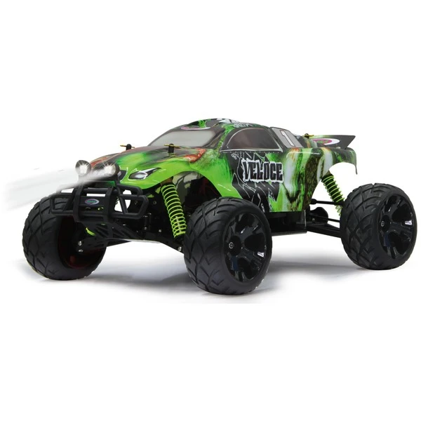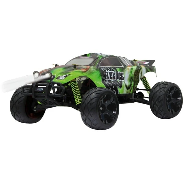 Der Jamara Veloce EP Lipo Monstertruck verfügt über einen kräftiger Bürstenmotor mit bis zu 20.000 U/min und einen programmierbaren Speedregler (40 A, gekühlt, programmierbar). Dank Allradantrieb mit Stahldifferentialen vorne und hinten kommt man überall gut voran. Dazu ist das Fahrwerk komplett einstellbar. Die Antriebswellen aus Stahl und die spritzwassergeschützte Elektronik stecken auch den täglichen Offroadeinsatz weg. Zur weiteren Ausstattung gehören zwei abnehmbare LED-Scheinwerfer, ein Aluminium-Chassis eloxiert im Titandesign, eine Aluminium-Chassisversteifung (oben), einstellbare Öldruckstoßdämpfer mit Aluminium-Stoßdämpferkappen, kugelgelagerte Radachsen und Antriebskomponenten, eine Pivot-Ball Vorderradaufhängung, schnelles und kräftiges Lenkservo sowie ein transparenter Hauptzahnradschutz.Art.-Nr.: 1537603