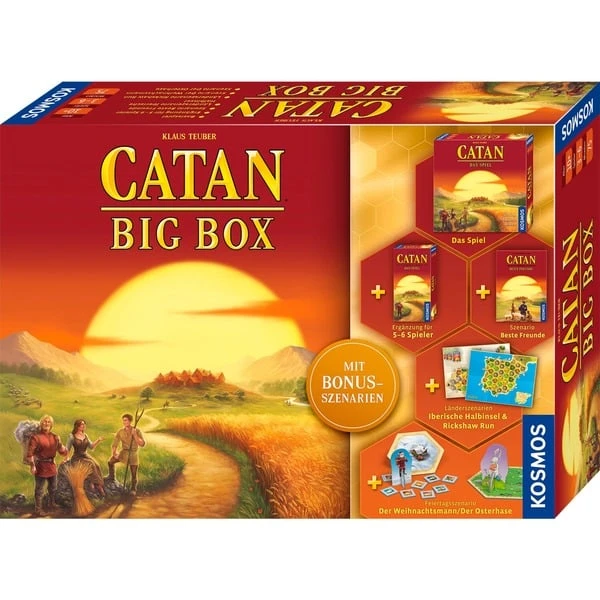 Mit der CATAN – Big Box kommt eine große Box voller Abenteuer in der Welt von CATAN. Diese Box enthält nicht nur das Grundspiel, sondern auch die Szenarien „Beste Freunde“, „Iberische Halbinsel“, Rickshaw Run“, „Der Weihnachtsmann“ und „Der Osterhase“. So tauchen 3-6 Spieler ab 10 Jahren in die Welt von CATAN ein, legen Straßen an und gründen die ersten Siedlungen und Städte. Durch geschickten Handel mit Rohstoffen bringen sie ihre Insel zu Wohlstand. Dieses Set ermöglicht nicht nur den Einstieg in die Welt von CATAN, sondern bietet auch immer wieder neue Herausforderungen und Abwechslung. Art.-Nr.: 100022262