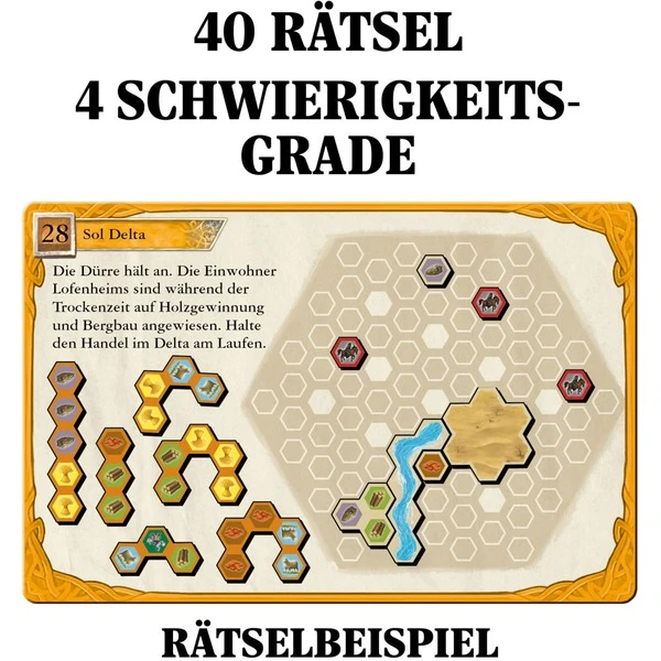 | Inhalt/Ausstattung | 1 Aufbewahrungsbox mit Spielfeld-Deckel, 40 Rätselkarten, 10-Handelsrouten-Teile, 5 Räuber-Teile, 5 Ritter-Teile, 5 Siedlungs-Teile, 5 Stadt-Teile, 2 Fluss-Teile, 1 Wüsten-Teil, Spielanleitung | ||