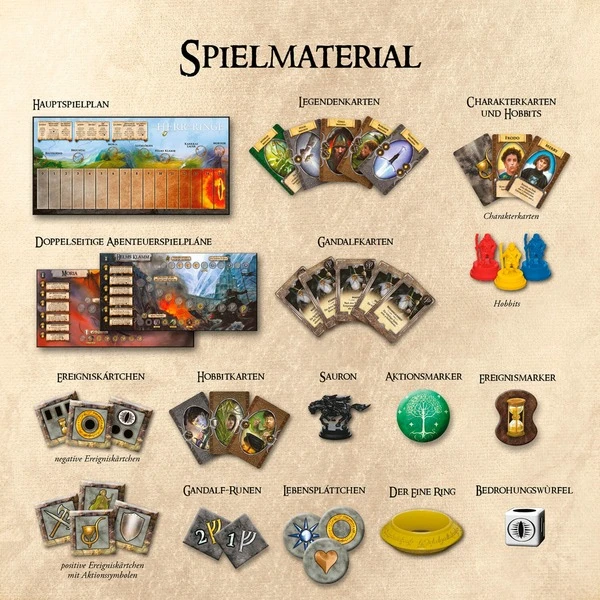 | Inhalt/Ausstattung | 1 Hauptspielplan, 2 doppelseitige Abenteuerspielpläne, 60 Hobbitkarten, 35 Legendenkarten, 5 Gandalfkarten, 23 Ereigniskärtchen, 5 Charakterkarten, 5 Hobbit-Spielfiguren, 1 Sauron-Spielfigur Schwarzer Reiter, 5 Aktionsmarker, 1 Ereignismarker, 11 Lebensplättchen, 32 Gandalf-Runen, 1 Bedrohungswürfel, Der Eine Ring, 1 Spielanleitung | ||