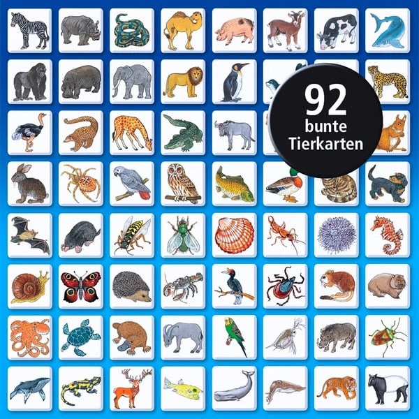 | Inhalt/Ausstattung | 92 Tier-Kärtchen, 24 Merkmals-Kärtchen, 4 Schweine-Figuren, 1 Schweine-Flugbahn, 16 Spielchips, 1 Lösungsheft mit Spielanleitung | ||