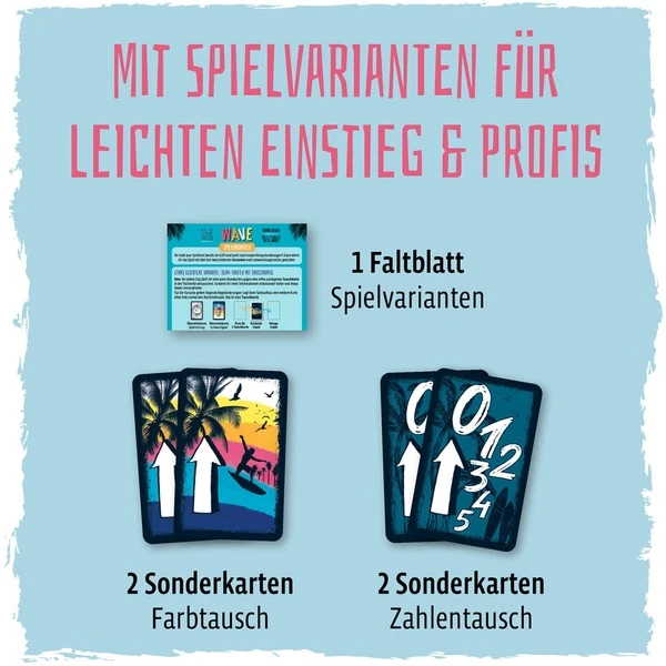 Mit diesem kooperativen Kartenspiel gewinnen alle – sie müssen allerdings auf der gleichen Welle surfen. Dazu legen zwei bis vier Spieler reihum je eine Karten auf den Ablagestapel, wobei Zahlenwert oder die Farbe jeweils steigen muss. Klingt ganz einfach, doch es gibt einen Kniff: Ein Teil der Spielkarten wird verkehrt herum auf der Hand gehalten. Nur die Anderen in der Spielerunde können die Vorderseite sehen und wissen, ob diese zum aktuellen Wasserstand passt. Um zu gewinnen, müssen sich alle gut absprechen. Denn sollte jemand keine Karte legen können, endet das Spiel vorzeitig. Ein kooperatives Kartenspiel mit innovativem Spielmechanismus.Art.-Nr.: 100022291