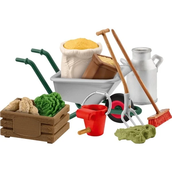 | Inhalt/Ausstattung | 1x Schubkarren, 1x Hafersack, 1x Leckerlisack, 1x Heu zum Aufspießen, 1x Heugabel, 1x Besen, 1x Kartoffel, 1x Salat, 1x Milchkanne, 1x Futterkiste, 1x Eimer für Kalb | ||