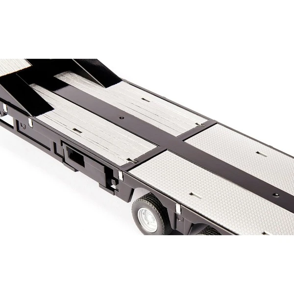 Wer schwere Fracht wie große Baumaschinen, Traktoren oder Betonteile transportieren will, braucht einen speziellen Tieflader. Die EURO-Tieflader des niederländischen Herstellers Nooteboom gelten als die besonders robust. Dank der hydraulischen Lenkung lassen sich die schweren Spezialtransporter außerdem ausgezeichnet manövrieren. Der 3-Achs-Tieflader von Siku ist dem Eurotrailer von Noteboom nachempfunden. Der Auflieger hat die Form eines tiefen Bettes, am Heck befindet sich eine elektronische Rampe, um die schwere Last leichter verladen zu können. Das Fahrgestell des Tiefladers ist aus Metall, der Aufbau auf Kunststoff. Für zusätzliche Stabilität im Stand lassen sich Stützfüße manuell ausfahren. Am Heck des Aufliegers befinden sich vier LEDs: Zwei Fahrlichter in Rot und zwei Blinker. Per Kabel mit Klinkenstecker wird der Tieflader mit der entsprechenden Bluetooth-Zugmaschine aus der CONTROL-Reihe verbunden – zum Beispiel mit einem LKW oder Traktor. Diese wiederum kann ganz einfach per CONTROL-App oder passendem Fernsteuermodul navigiert werden.