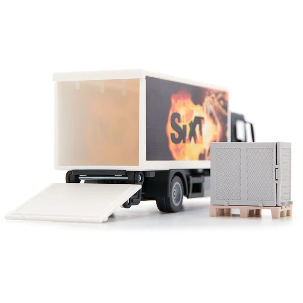 Der MAN LKW mit Kofferaufbau von SIKU kommt mit Sixt-Logo und Dinosaurier-Print auf der Aufbauseite. Dieser LKW verfügt über eine zu öffnende Ladebordwand am Heck und kommt mit einer Palette und einer Gitterbox. Das Fahrerhaus ist dem Original-LKW von MAN detailgetrau nachempfunden. Art.-Nr.: 1902863