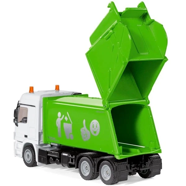 Der Müllwagen aus der Serie SUPER von SIKU setzt sich aus einem Mercedes-Actros-Fahrerhaus und einem langen 3-Achs-Fahrgestell zusammen. So entsteht ein wuchtig gestalteter Müllwagen im Maßstab 1:50. Der komplette Heckbereich des fast ausschließlich aus Metall gefertigten Fahrzeugs kann hochgeschwenkt werden und gibt den Blick auf den geräumigen Laderaum des Müllwagens frei. Mittels einer von außen zu bedienenden Abschiebeeinrichtung kann der gesammelte Inhalt herausgeschoben werden. Eine Mülltonne aus Kunststoff mit zu öffnendem Deckel wird als Zubehör mitgeliefert.Art.-Nr.: 1902840